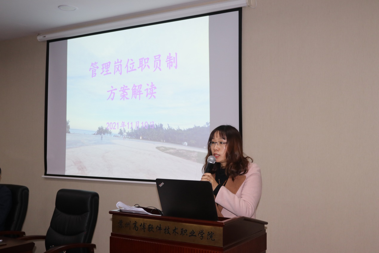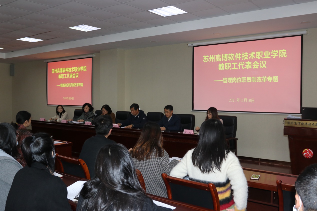11月10日下午,学校在行政楼215会议室召开教职工代表专题会议,会议审议通过《苏州高博软件技术职业学院管理岗位职员制度改革方案(讨论稿)》(以下简称“方案”)。党委副书记、副校长倪筱琴、副校长陈家颐、副校长张明燕、副校长张建初等校领导和工会主席、人事处负责人出席会议,各机关及二级学院主要负责人列席会议。会议由党委副书记、副校长倪筱琴主持。