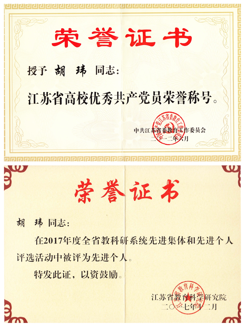 江苏省高校优秀共产党员、江苏省科研系统先进个人