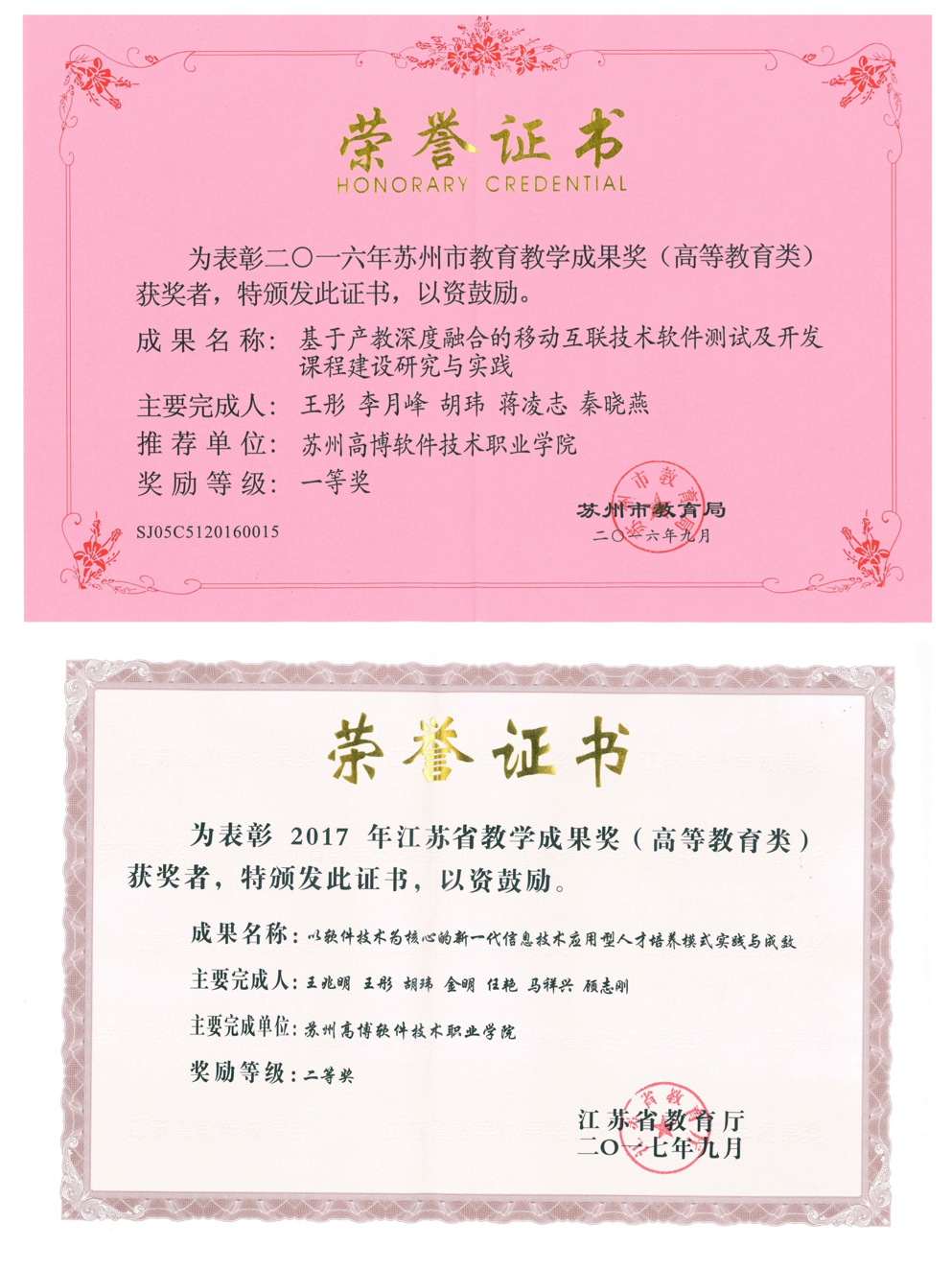 苏州教学成果奖一等奖、江苏省教学成果奖二等奖