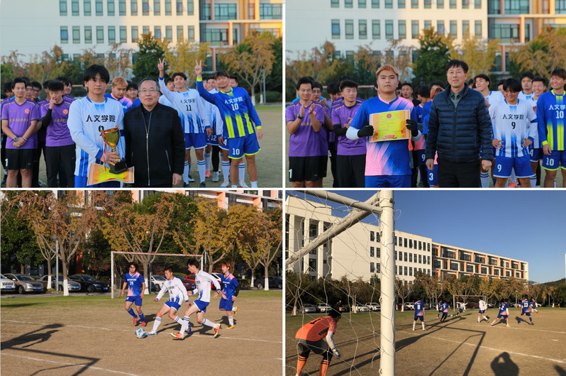 11月24日下午15:00,学校第十一届足球联赛的最后一场比赛在足球场开战,参加比赛的两支队伍分别是人文学院代表队与信软学院代表队。学校党委副书记、副校长徐子良,学校校长办公室主任王绍福,学生处处长邹艳星,校团委书记王鑫以及各学院副书记、分团委书记、辅导员代表共同观看了比赛。