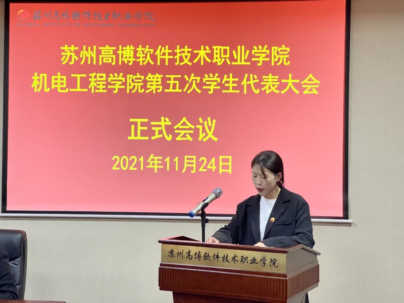 在校团委的关怀指导和机电工程学院党总支的正确领导下,经各级团组织和广大团员青年学生的长期共同努力,精心筹备之下,苏州高博软件技术职业学院机电工程学院第五次学生代表大会(简称:“苏州高博软件技术职业学院机电工程学院第五次学代会”)于2021年11月24日下午16:00在行政楼215学术报告厅顺利召开。