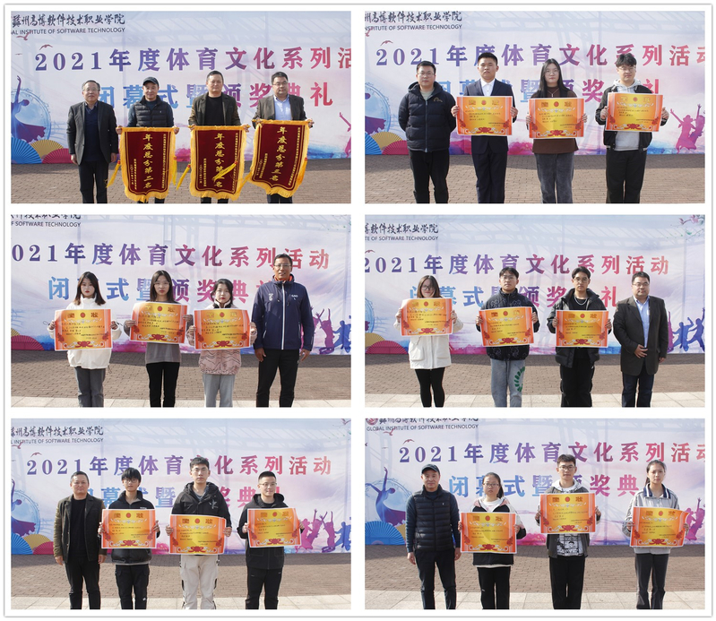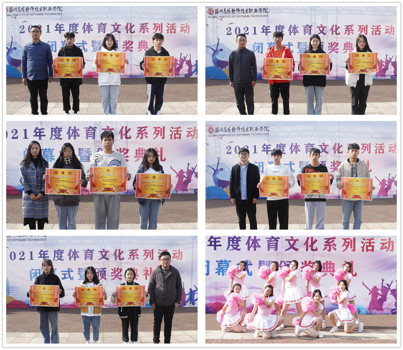 总裁判长高亮主任授宣读了趣味运动会各项目比赛成绩和2021年度体育文化系列活动的表彰结果。各参会领导分别为趣味运动会项目比赛前三名的队伍代表颁发奖状,徐子良副校长为获得体育年度总分前三名的二级学院颁发奖状。