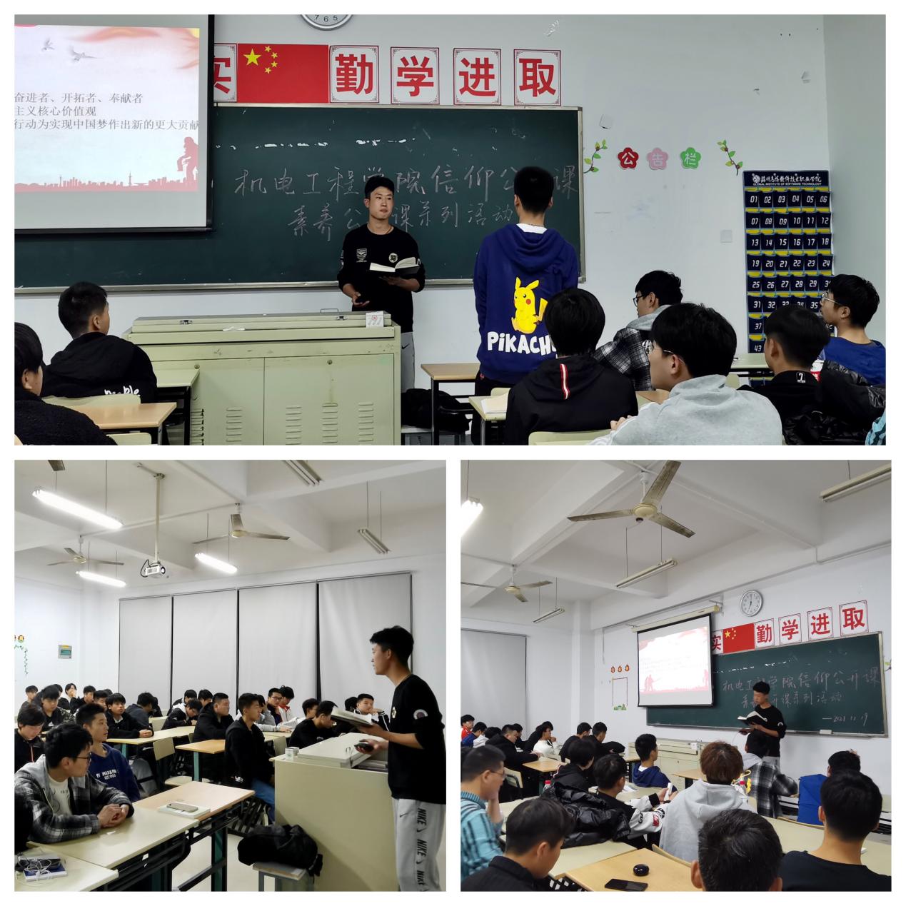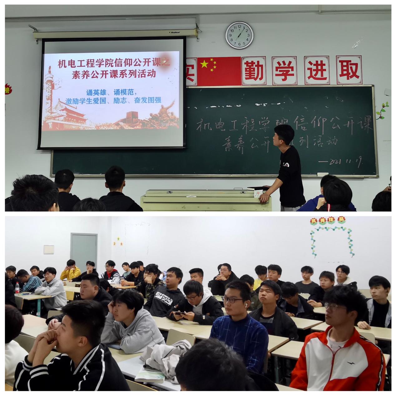 为培育和践行社会主义核心价值观,弘扬中华民族优秀传统文化。机电工程学院分团委于11月18日18:30在12-407教室开展以“诵英雄、诵模范,激励学生爱国、励志、奋发图强”为主题的“诵读学传”素养公开课。由机电工程学院学生会主席团成员张慧楠同学担任主讲。