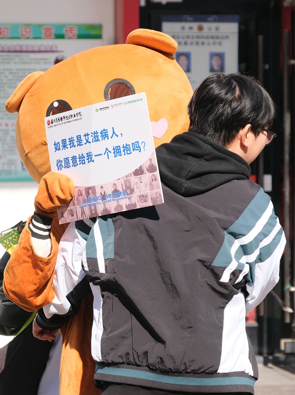 活动现场,同学们积极参与互动,通过活动多方位加强了对艾滋病的了解。今年的广场宣传活动中,延续了去年“行为艺术”活动,旨在提倡反对歧视,平等接纳艾滋病患者。12名志愿者身穿可爱的卡通服,举着牌子——如果我是艾滋病人,你愿意给我一个拥抱吗?活动发现,开展过同伴教育活动后,大家对艾滋病有了更为客观的认识,减少了歧视和成见。