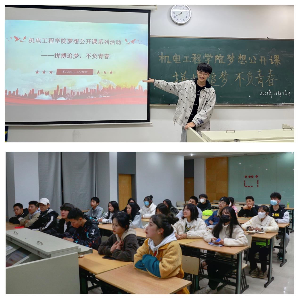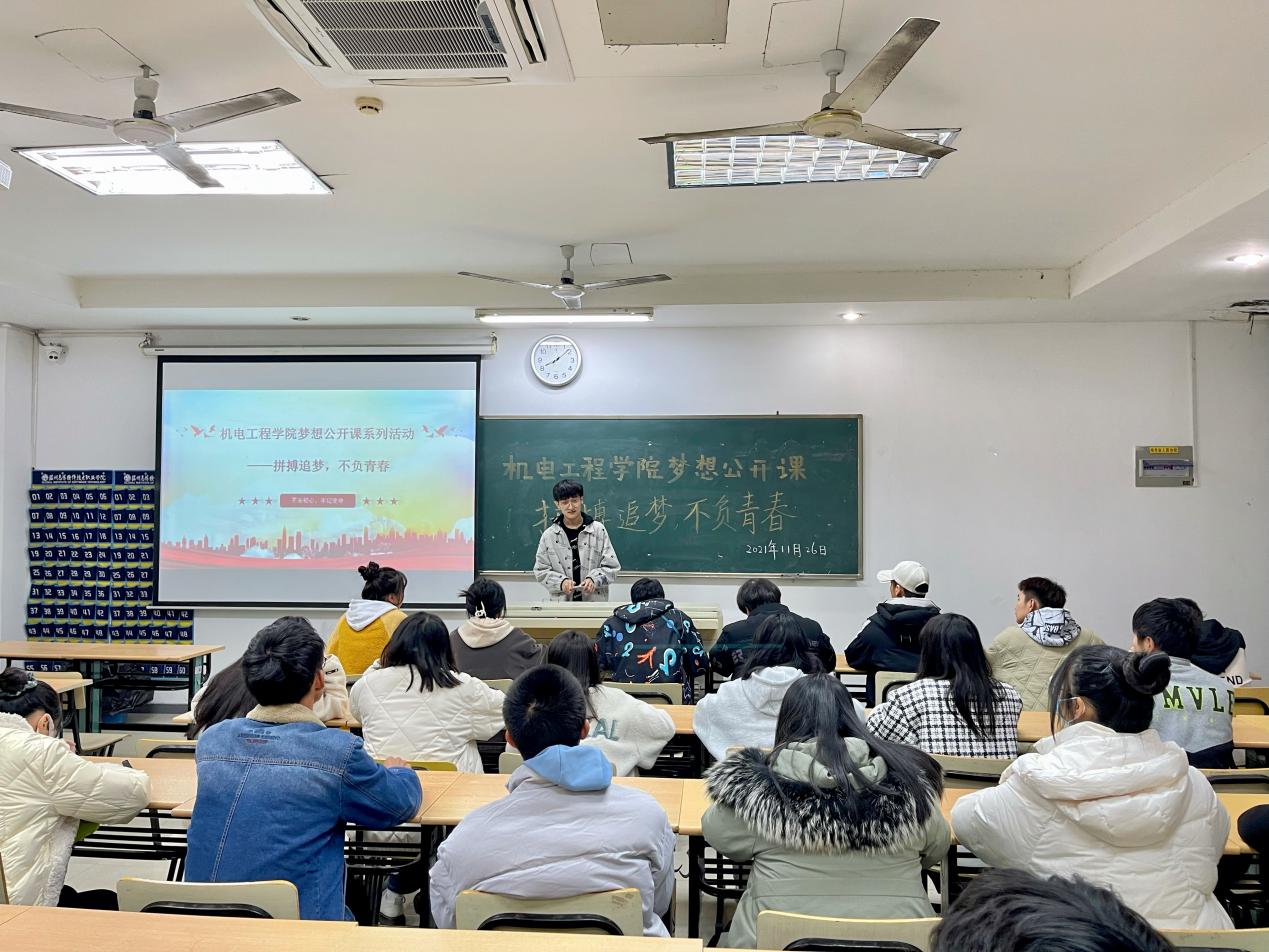 为鼓励同学昂扬奋斗,追逐梦想,引导同学树立正确的世界观、人生观、价值观。机电工程学院分团委于11月26日晚8点在12-515教室开展以“拼搏追梦,不负青春”为主题的梦想公开课系列活动。由本次活动由机电工程学院学生会主席团成员李旭峰同学主讲。