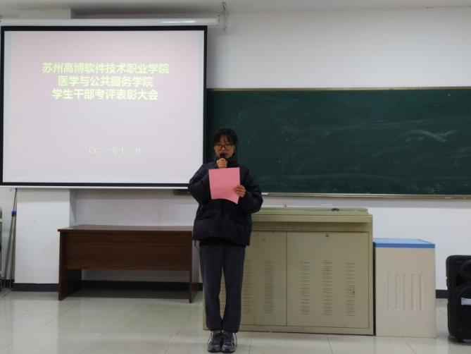 大会在庄严的国歌声中拉开帷幕。首先,医学与公共服务学院学生会执行主席杜婷婷同学发言。杜同学对2021年学生会工作进行总结,总结成功经验,对不足之处进行反思。接着,分团委书记贺茜老师宣布了表彰决定,辅导员老师们为优秀学生干部颁奖,对同学们的努力给与肯定。随后,优秀学生干部代表金淑涵同学发言。代表学生干部对老师们地悉心培养表达感谢,并表示会再接再厉,努力拼搏,争取更优秀的成绩。最后,医学与公共服务学院直属党支部副书记赵洪鹏老师进行总结讲话。希望大家能在下一学期继续努力,共同进步。