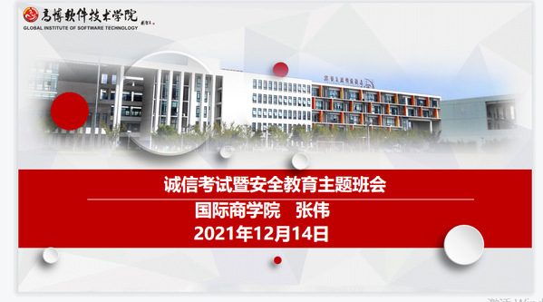 为端正考风,严肃考纪,进一步增强学生的诚信考试意识,引导学生诚信考试、诚信做人,在期末考试即将到来之际,12月14日,国际商学院20级学生利用课余时间召开了关于“诚信考试、安全离校”教育主题班会,因疫情防控要求和教室资源紧张,本次班会采取了线上直播的形式。