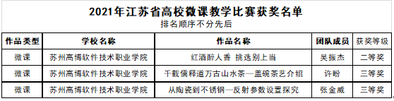 近日,由江苏省高等学校教育技术研究会主办的“2021年全省高等学校微课教学比赛”公布了比赛结果。我校共有3项作品获奖,其中国际商学院吴振杰老师的作品《红酒醉人香 挑选别上当》荣获二等奖,国际商学院许盼老师的作品《千载儒释道 万古山水茶—盖碗茶艺介绍》和艺术学院张金威老师的作品《从陶瓷到不锈钢—反射参数设置探究》荣获三等奖。这不仅充分展示了我校教师风采及课程建设成果,也充分说明了我校在推动教师专业发展和教学能力提升方面取得了突出成绩。