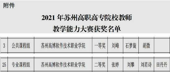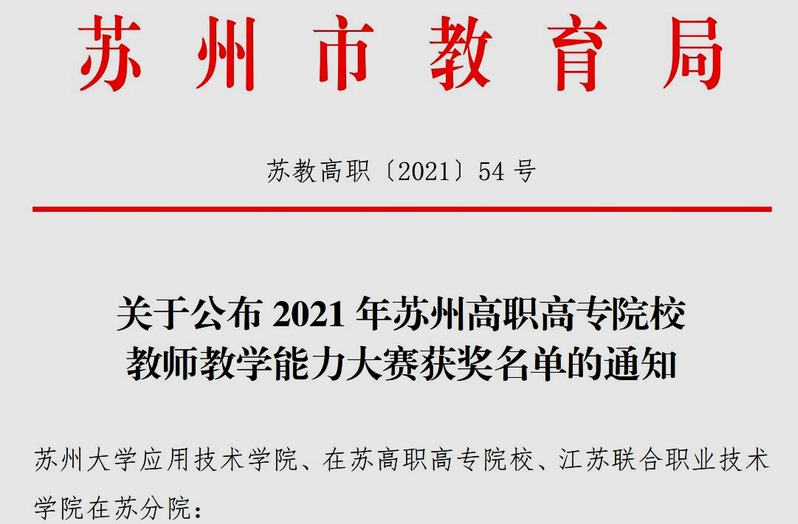 日前,2021年苏州高职高专院校教师教学能力大赛成绩揭晓,经过激烈角逐,我校参赛教师表现优异、再创佳绩,荣获一等奖、二等奖各1项,获奖等次与数量位列全市高职院校前列。