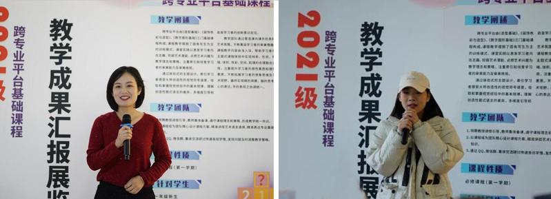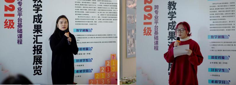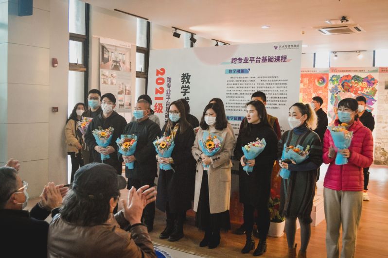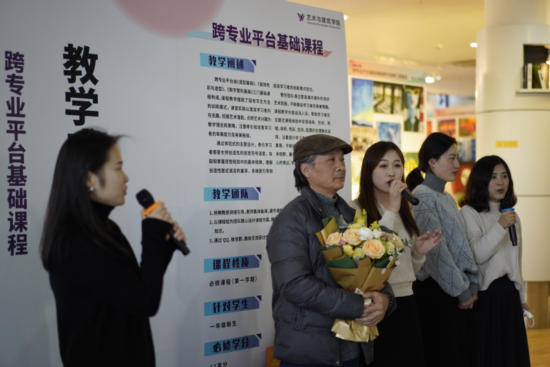 在《每当我走过老师窗前》的优美歌声中,展览拉开了序幕。学生们为基础课程教师团队献上了充满感恩的花束,陈烁宇同学分享一学期的学习体验和感悟。教师代表王婷分享了她对基础课程教学的感悟和反思。她认为艺术教育的本质是启发人性,拓宽自我认知。基础课程教学的意义在于拓宽眼界、提升审美,帮助学生用更智慧的眼光来看待世界。她带领教师团队献唱《最初的梦想》,为正在追梦路上的同学们注入了前进的动力和勇气。