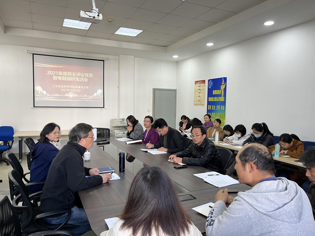 为深入学习贯彻习近平新时代中国特色社会主义思想和党的十九届六中全会精神,严格党内政治生活,进一步增强党支部凝聚力,按照校党委的统一部署和要求,人文社会科学学院直属党支部于12月23日在14-234会议室召开了2021年度民主评议党员暨专题组织生活会,本次会议由我校校长助理兼人文社会科学学院院长、特聘教授黄兴主持,校党委副书记、副校长倪筱琴教授莅临指导,学院全体党员出席会议。