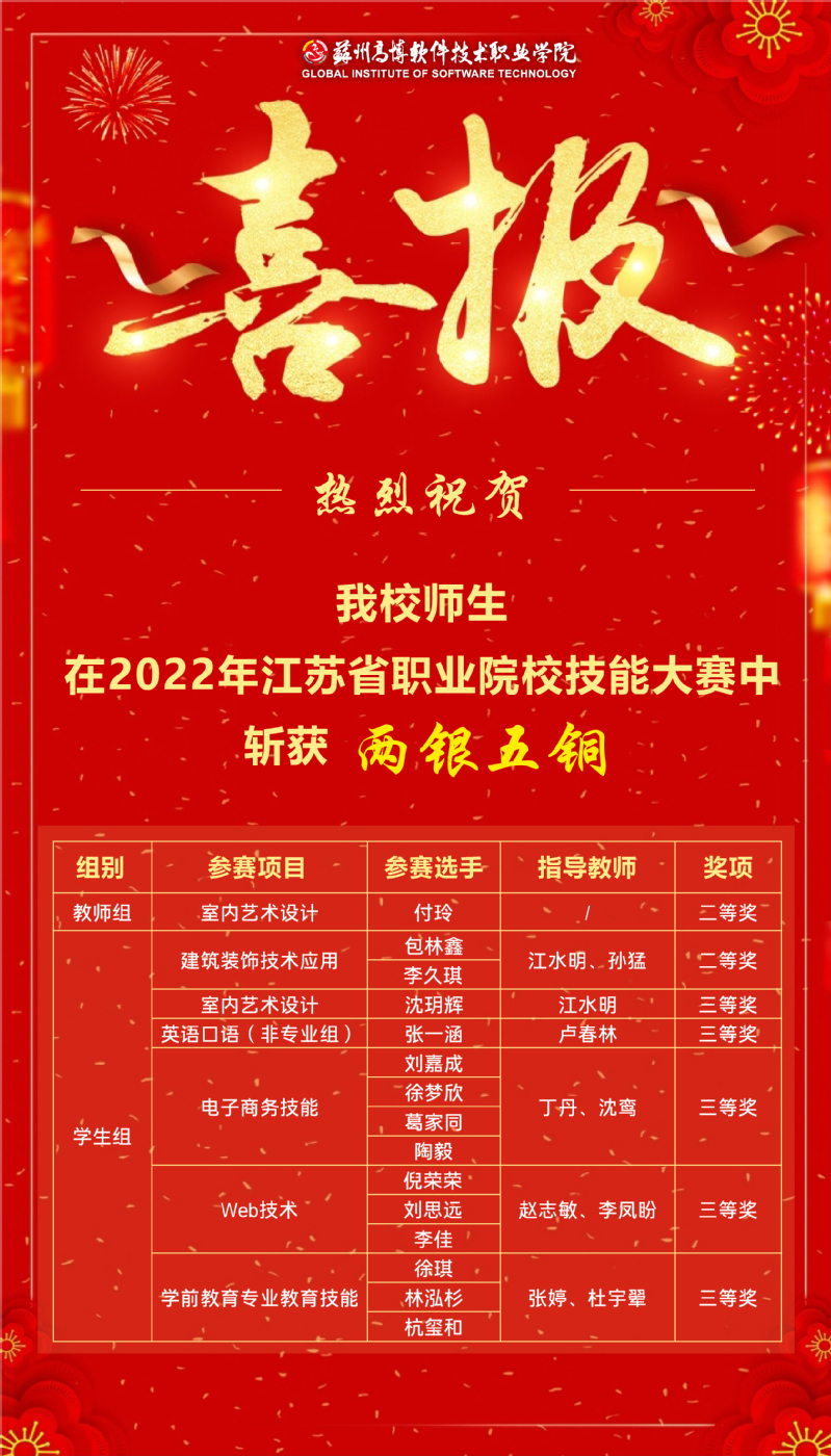 喜报:我校师生在2022年江苏省职业院校技能大赛中再创佳绩,斩获两银五铜!