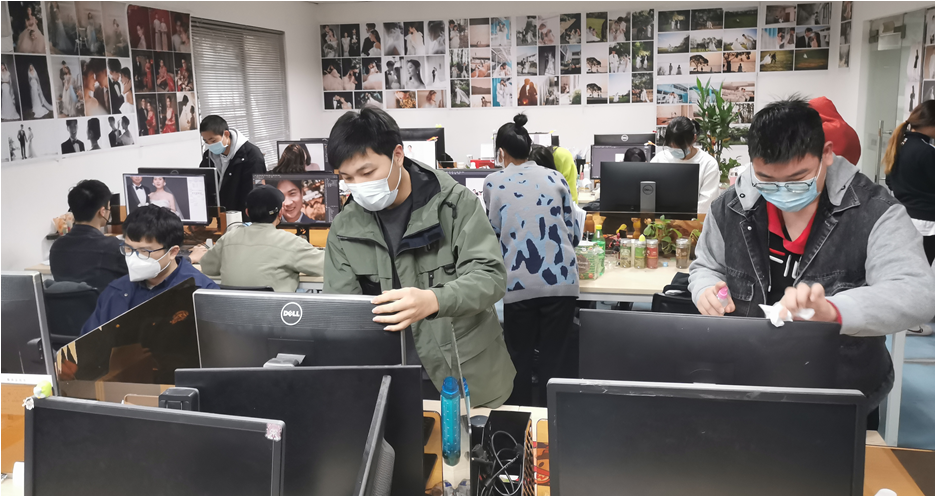 艺术与建筑学院党政领导强调三点要求:一、8位同学在苏州纽约婚纱摄影公司实习期间,要一切服从公司的防疫规定和要求,协助做好门店办公区域和宿舍酒精消毒及个人卫生工作。二、婚纱摄影公司要配置口罩、酒精、免洗手液等防疫用品,并在各个入口设置防疫检查关口,每天专人负责测量体温,检查“苏康码”、“行程码”、“核酸检测报告”。三、公司及时要在微信群实时转发苏州市关于疫情防控的相关通告,做到信息畅通,如发现“黄码”等情况,坚决执行“黄码”处理方案;如学生有任何困难及时向学院和公司反映。基于学院党政领导提出的要求,企业指导教师袁艺主管积极配合学院防疫工作,对实习学生的宿舍、电脑工作台、室内外空间进行一天两次喷洒消毒液,确保生活工作区域不被病毒侵袭,同时发放口罩、酒精消毒液和红外线体温计等物资,并要求学生佩戴口罩、检测体温,做好自身的防疫工作。学院党政领导对实习学生防疫工作高度重视,决不让任何一个学生掉队,确保学生安然无恙,使之顺利开展实习。工学结合班学生陶兴兰同学感慨地说:“疫情来的很突然,谁都没有料到,有学院领导和公司领导对我们的非常关心,做实做细各项防疫措施,给我们送温暖,让我们实习期间安心放心,感谢学院领导与公司领导对我们学生的关爱和帮助”。