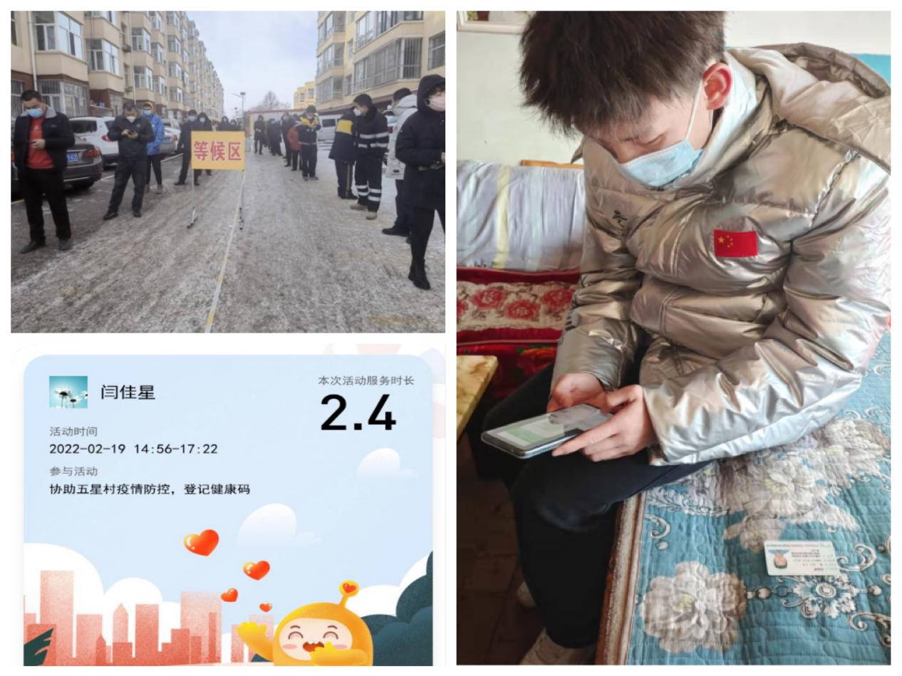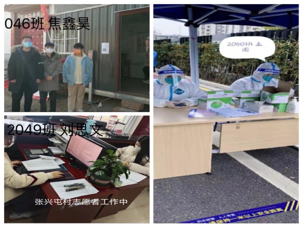 2046班市场营销专业焦鑫昊同学在河北省枣强县王均乡参加疫情防控志愿服务,负责值班测体温,登记健康码;2049班电子商务专业的刘思文同学在河北省沧州市河间市米各庄镇张兴屯村参加疫情防控志愿服务,负责采集往返人员信息;2050班酒店管理专业孟圆同学在吴中区木渎镇金山浜社区玉景花园b区参加疫情防控志愿服务,负责协助工作人员登记采样信息。