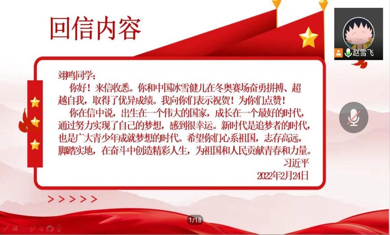 活动总结环节,赵老师号召大家要持续学习贯彻“回信精神”,学习冰雪健儿勇于突破、团结协作、不屈不挠、勇攀高峰的精神,为热爱而坚持,为梦想而冲刺,抓住机遇,努力实现属于自己的青春梦想!