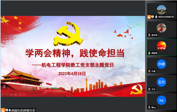 为深入学习贯彻落实“两会”精神,凝聚奋进力量,提高全体党员政治素养,从而更好地发挥教育者的示范作用,2022年4月18日中午1点,机电工程学院教工党支部组织开展云端“学两会精神 践使命担当”主题党日活动。会议由党支部书记韩丽东主持,全体教工党员参会。