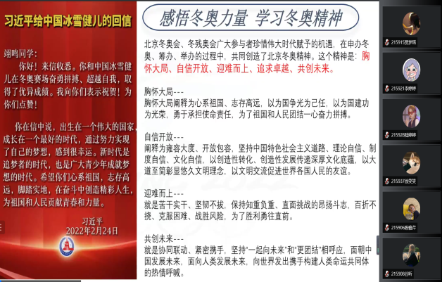 本次的团日活动主要以专题研讨,交流分享等形式对习近平总书记重要回信精神进行认真的探讨。教育活动主要以习近平总书记的重要回信精神,讲好冬奥故事,传递志愿精神,开展形式多样的爱国主义教育这四个方面展开。