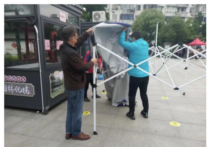 30日早上5点20分,三名志愿者就分别到玉兰苑点位报到。黄兴和赵明旭两人一报到就立即投入到帐篷搭建工作。“社区居民们一般来得比较早,我们得提前把准备工作做好,”黄兴一边干一边说。很快便与社区工作人员一起搭起了六个工作台“蓝帐篷”。