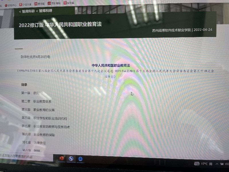 为深入学习贯彻习近平总书记关于职业教育的重要指示精神和全国职业教育大会精神,大力宣传劳模精神、劳动精神、工匠精神弘扬劳动光荣、技能宝贵、创造伟大的时代风尚,向全社会宣传职业教育“前途广阔、大有可为”,聚焦“提高质量,提升形象”,展示职业教育重大改革发展成果,营造全社会关心支持职业教育的良好氛围,以实际行动迎接党的二十大胜利召开,苏州高博人文社会科学学院积极做好2022职业教育活动周(2022年5月8-14日)教育部等十部门通知)实践教育活动,学院党政领导高度重视,第一时间将新修订的《职业教育法》全文转载学院网站《智库科研》专栏,号召广大师生员工深入研读、悉心领会,做到“学思践悟”高度融合,并将学习内容专门安排在学院理论学习中心组(扩大)5月份学习活动,切实将新修订的《职业教育法》精神落实到平常的教科研实际,奋力开创学院各项事业新局面。(供稿:人文社会科学学院)