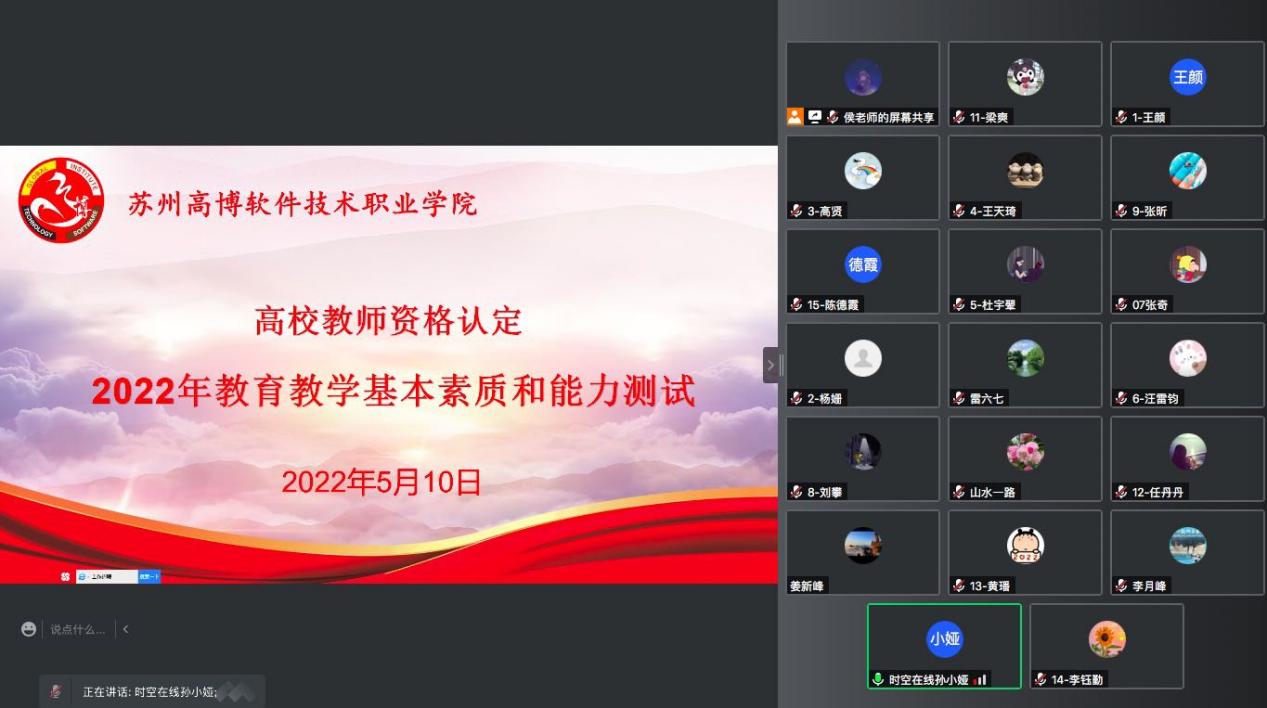 5月10日,我校人事处组织开展了2022年高校教师资格认定教育教学基本素质和能力线上测试工作。会议分别由校长助理黄兴、医学与公共服务学院院长孙小娅主持,人事处龚三琼处长、教务处雷六七教授、医学与公共服务学院姜新峰教授、信息与软件学院李月峰副教授,国际商学院罗正英教授、人文社会科学学院吴歧范副教授等相关专业教师担任评委。