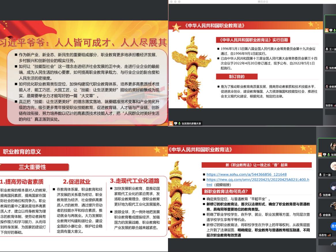 为学习贯彻《中华人民共和国职业教育法》,落实全国职业教育大会精神和相关工作部署,展示我校职业教育改革创新发展成果,营造全社会关心支持职业教育的良好氛围,以实际行动迎接党的二十大胜利召开,结合学校实际,机电工程学院学生党支部于2022年5月11日19:00开展线上宣传会议,本次会议由15名机电学院学生预备党员、12名青马学员参加,机电工程学院学生党支部书记王一迪老师主持。