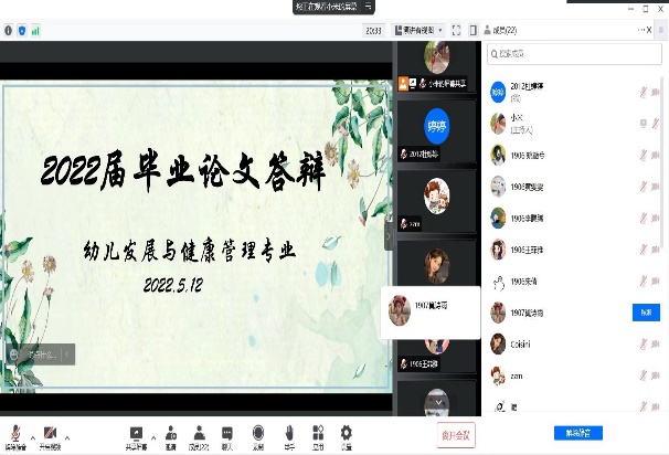 2022年5月12日,第14个防灾减灾日,同时又是第111个国际护士节,在这特殊的日子里,医学与公共服务学院2022届幼儿发展与健康管理专业毕业论文答辩工作如期举行,共61名学生参加。受疫情影响,本次答辩工作通过腾讯会议平台线上进行。