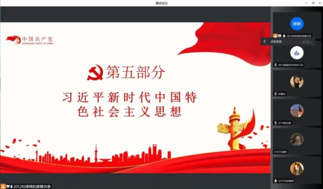 首先,杜婷婷同学引用了习近平总书记话语:“中国人民具有伟大创造精神、伟大奋斗精神、伟大团结精神、伟大梦想精神。”伴随着马克思主义中国化的进程,中国人民的创造精神发挥得淋漓尽致,走出了一条独一无二的中国特色社会主义道路。接着,杜婷婷同学联系当下抗击疫情实事,讲述抗疫青年的感人故事。大家坚信在疫情中只要每个人积极配合,合理运用科学办法防范,团结一心、奋斗向上,以青年力量为社会做贡献,一定会打赢这场疫情阻击战。最后,杜婷婷同学再次强调,今年是进入全面建设社会主义现代化国家、向第二个百年奋斗目标进军新征程的重要一年,今年将召开党的二十大。她鼓励同学们要踔厉奋发、笃行不怠,为党和人民事业拼搏奉献。