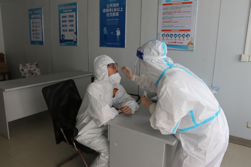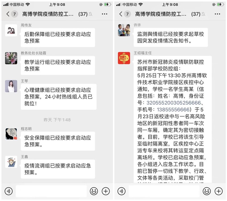 此次演练场景设置背景为:5月25日下午13:30接区疾控中心通知,学校一名学生高某(信息包括:姓名、身份证号、手机号)于5月23日返校途中与一名高风险地区的新冠阳性患者同一车次同一车厢,确定其为密切接触者。疾控中心正派专车来校将其转运至定点隔离场所,并对学校处置措施进行指导和评估。疫情报告人接到电话后,立即上报学校新冠肺炎疫情防控应急工作总指挥,总指挥要求迅速启动应急机制。副总指挥王凤英第一时间在高博学院疫情防控工作群中通知学校新冠肺炎疫情防控应急工作体系下辖各组进入紧急状态,应急人员立即到岗,应急处置立即展开。同时,疫情报告人通知校医穿好防护服,前往现场处置,引导学生进入临时隔离室,进行抗原检测。经检测,抗原检测结果为阴性。