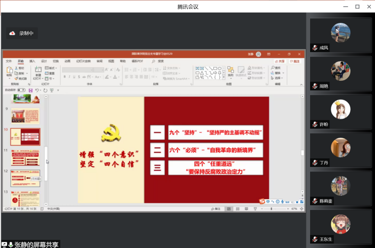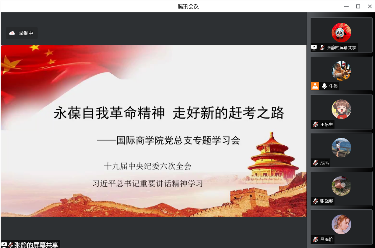 5月29日晚,国际商学院党总支组织召开党员线上专题学习会,集体学习十九届中央纪委六次全会习近平总书记重要讲话精神,主讲人是国际商学院党总支宣传委员、副院长张静。