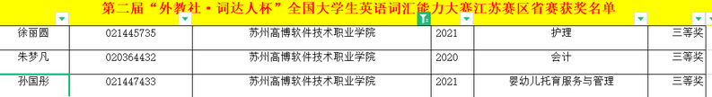 5月21日,第二届“外教社•词达人杯”全国大学生英语词汇能力大赛江苏赛区比赛在云端拉开了帷幕,从全省130余所本科和职业院校13万余名初赛选手中选拔出的6000余名优胜者参加了此次省赛。我校经过校内初赛选拔,组织了20名学生参加了省决赛。经过激烈角逐,我校护理专业徐丽圆、会计专业朱梦凡、婴幼儿托育服务与管理专业孙国彤等三名学生获得了三等奖,卢春林、黄琼、张迪等三名教师获得优秀指导教师奖。