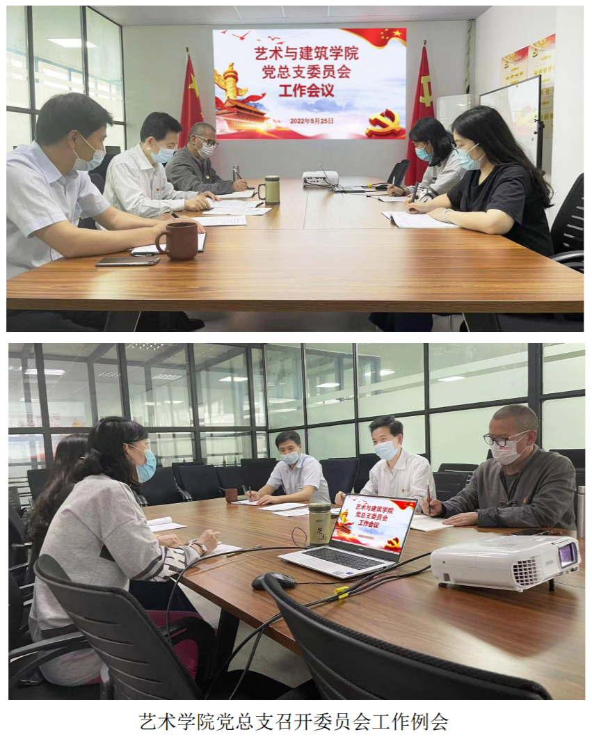 5月25日中午12:30,艺术与建筑学院党总支在党员活动室召开党总支委员会工作例会,学习学校党委关于意识形态工作的通知精神、安排部署2022春季学期师生返校报到及贯彻落实“两代会”工作。党总支书记、副院长施建平教授、党总支副书记纪冰心老师、组织委员李一帆老师、宣传委员吴兵副教授、纪检委员张斌副教授参加会议,会议由施建平主持。