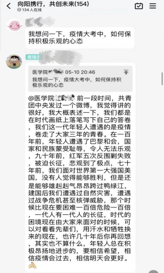 在“解忧记事·高博处方”活动中,通过收集表小程序,同学们诉说疫情期间的感受、日常生活中的趣事或学习上的烦恼,互相给予安慰与建议,构筑人与人之间爱的桥梁。2012班杜婷婷同学在QQ群内提出了自己的烦恼并且得到了满意的回答,她认为这次心理活动可以互动交流、互相鼓励,可以给别人带来温暖。