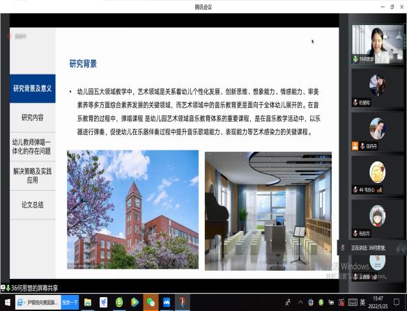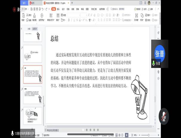 2022年5月25日下午14:00,苏州科技大学2022届学前教育专业46名学生,在腾讯会议分两组同时进行线上答辩。第一组,由幼儿教育系主任张婷老师主持,邀请苏州科技大学教育学院张晋老师参与线上指导;第二组,由幼儿教育系专业负责人田丹丹老师主持,邀请苏州科技大学教育学院张晋老师参与线上指导。
