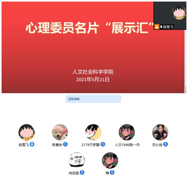 5月21日,心理委员名片“展示汇”活动在“云端”正式拉开帷幕。我院6名心理委员经过会前精心准备,在线上积极为自己打CALL,对自己的名片制作思想以及工作理念展开精彩讲解,展现了我院心理委员们的风采。心理委员是高校开展心理健康工作的重要基层骨干,是心理健康知识的宣传者、是班级同学心理危机问题的发现者、同学们心理健康的维护者、自身心理健康的示范者。让我们为其点赞!