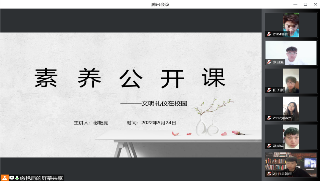 为了进一步加强学生文明礼仪教育,充分发挥学校文明窗口的作用,带动家庭、社会文明建设,我院十分注重将文明礼貌教育渗透到学生的日常学习生活中,并积极开展文明礼仪教育活动,以促进学生良好品格的发展。为更好地提高工作的实效,5月30日,信息与软件学院开展以“文明礼仪在校园”为主题的素养公开课活动,本次公开课由信息与软件学院组织建设部部长缴艳昆同学主讲。
