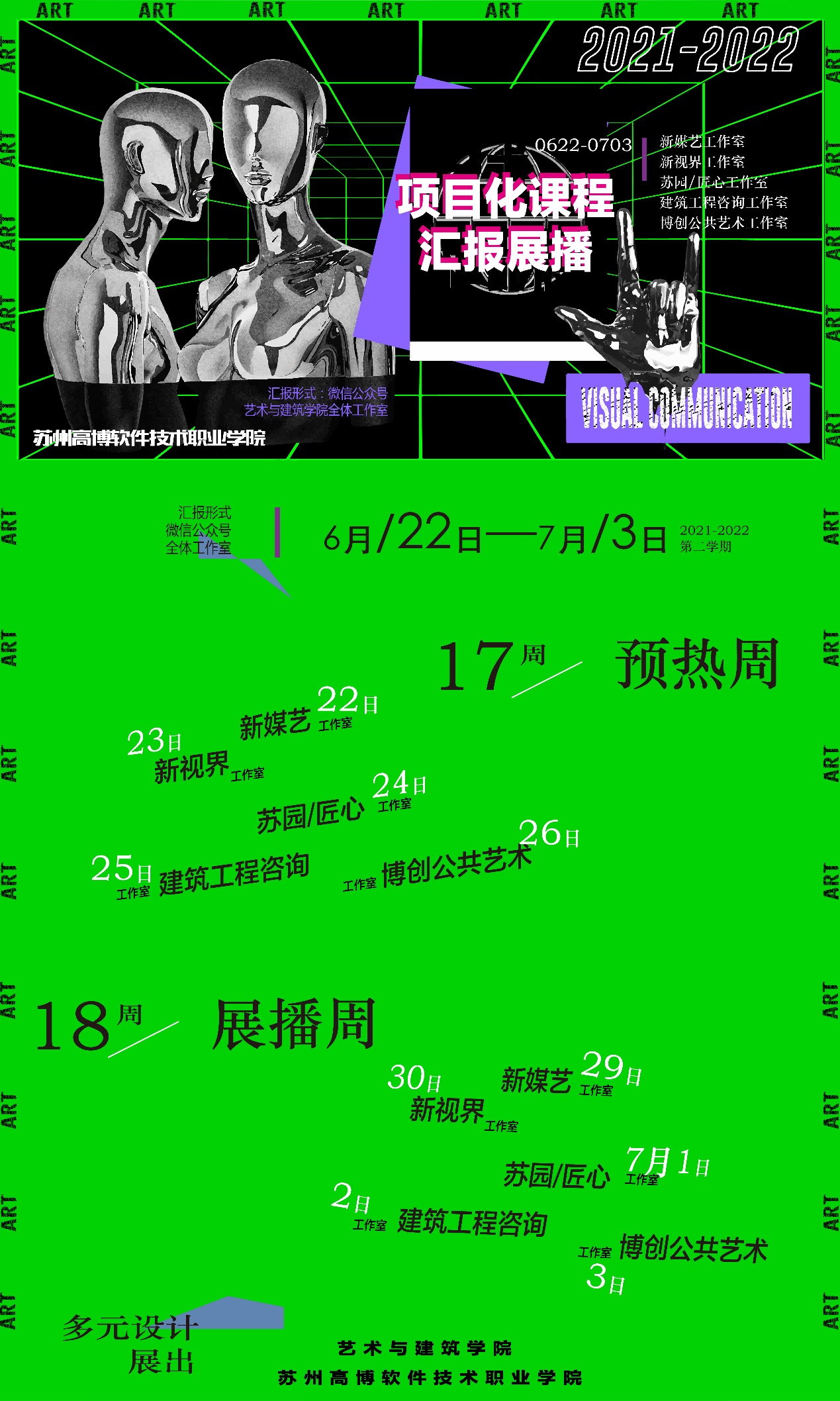 艺术与建筑学院将首次采用项目化课程展播形式尝试以工作室为中心的教学评价,敬请期待!展播日期:6月22日—7月3日展播形式:微信公众平台展播单位:艺术与建筑学院全体工作室艺术与建筑学院 2022年6月21日