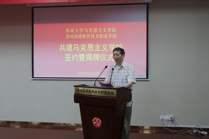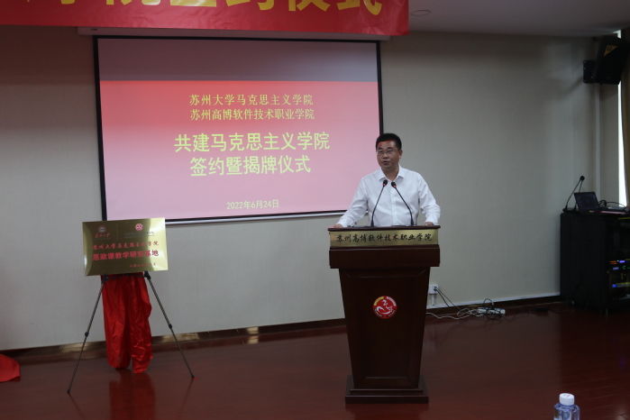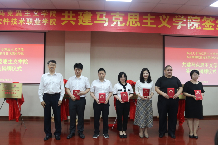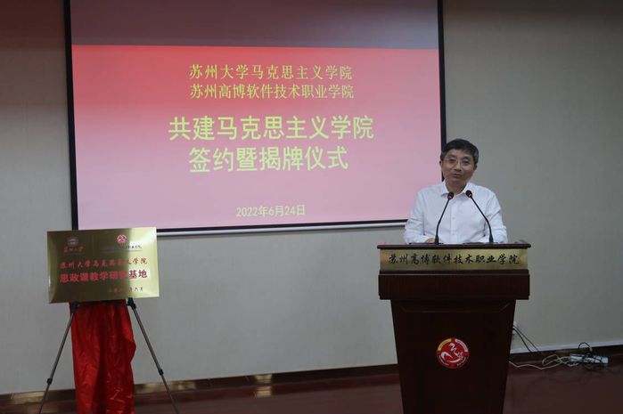 仪式上,苏州大学马克思主义学院院长田芝健、我校人文社会科学学院院长黄兴代表双方签订结对共建协议书。与会领导先后为“苏州大学马克思主义学院 苏州高博软件技术职业学院 共建马克思主义学院”、“全国高校思政课名师工作室(苏州大学‘思政田园’)名师工作坊”、“苏州大学马克思主义学院思政课教学研究基地”、“苏州大学马克思主义学院研究生工作站”揭牌。我校副校长张建初宣读了《关于聘任苏州大学马克思主义学院朱蓉蓉等6名教师为高博学院思想政治理论课兼职教学导师的决定》,并为6位教学导师颁发聘书。