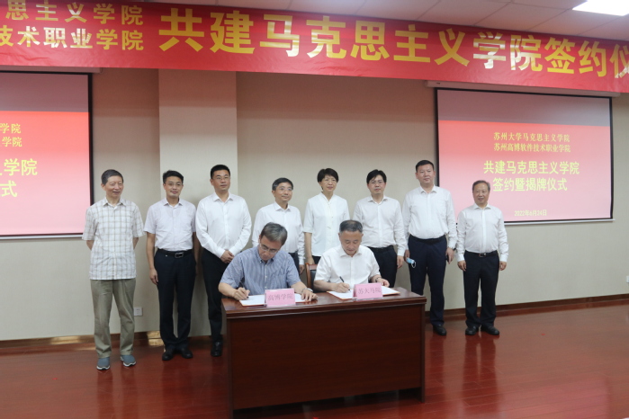 为全面贯彻落实习近平总书记关于思想政治理论课建设的重要论述,落实中共中央办公厅印发的《关于加强新时代马克思主义学院建设的意见》文件要求,充分发挥苏州大学马克思主义学院作为江苏省示范马克思主义学院的辐射引领作用,全面加强我校马克思主义学院建设,6月24日,我校与苏州大学马克思主义学院共建马克思主义学院签约暨揭牌仪式在行政楼215报告厅隆重举行。苏州市委教育工委书记、教育局局长周志芳,苏州高新区党工委委员、宣传部部长李志军,高新区教育工委书记、教育局局长周剑,高新区工委宣传部副部长庞晓红,苏州大学党委书记江涌,苏州大学党委副书记邓敏,苏州大学党委常委、组织部部长查佐明,苏州大学党委办公室主任刘春雷,苏州大学马克思主义学院党委书记陈建军、院长田芝健等领导出席了仪式。我校校长朱秀林等党政领导班子成员以及相关职能部门负责人、教师代表参加了仪式。仪式由我校党委书记薛辉主持。