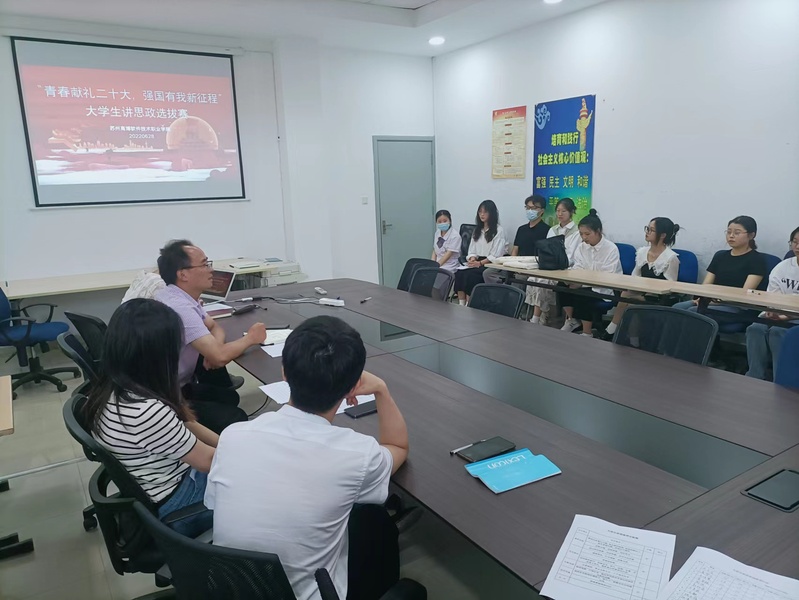 为深入贯彻落实习近平总书记关于“大思政课”的重要指示批示精神,充分发挥高校思政课立德树人关键课程作用,坚持不懈用习近平新时代中国特色社会主义思想铸魂育人,根据江苏省委教育工委《关于开展习近平新时代中国特色社会主义思想大学习领航计划主题教育活动的通知》、《“青春献礼二十大,强国有我新征程”迎接学习宣传党的二十大主题宣传教育活动工作方案》等通知要求,我校马克思主义学院于6月28日在会议室举办以“青春献礼二十大·强国有我新征程”为主题的大学生讲思政选拔赛。