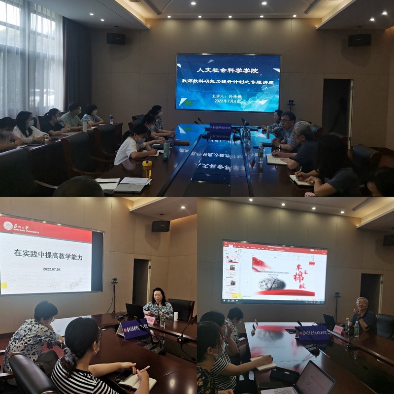 为拓展我校外语教师的教学思路,多维度提高外语教学团队的教科研水平,2022年7月4日下午,人文社会科学学院在行政楼会议室成功举办了“教师教科研能力提升计划”系列活动第二次专题讲座。本次讲座邀请了教育部大学外语教学指导委员会委员、江苏省教学名师、苏州大学外国语学院教授孙倚娜和我校特聘教授洪庆福两位担任主讲,外语系全体教师聆听了讲座。讲座由校长助理兼人文社会科学学院院长黄兴主持。