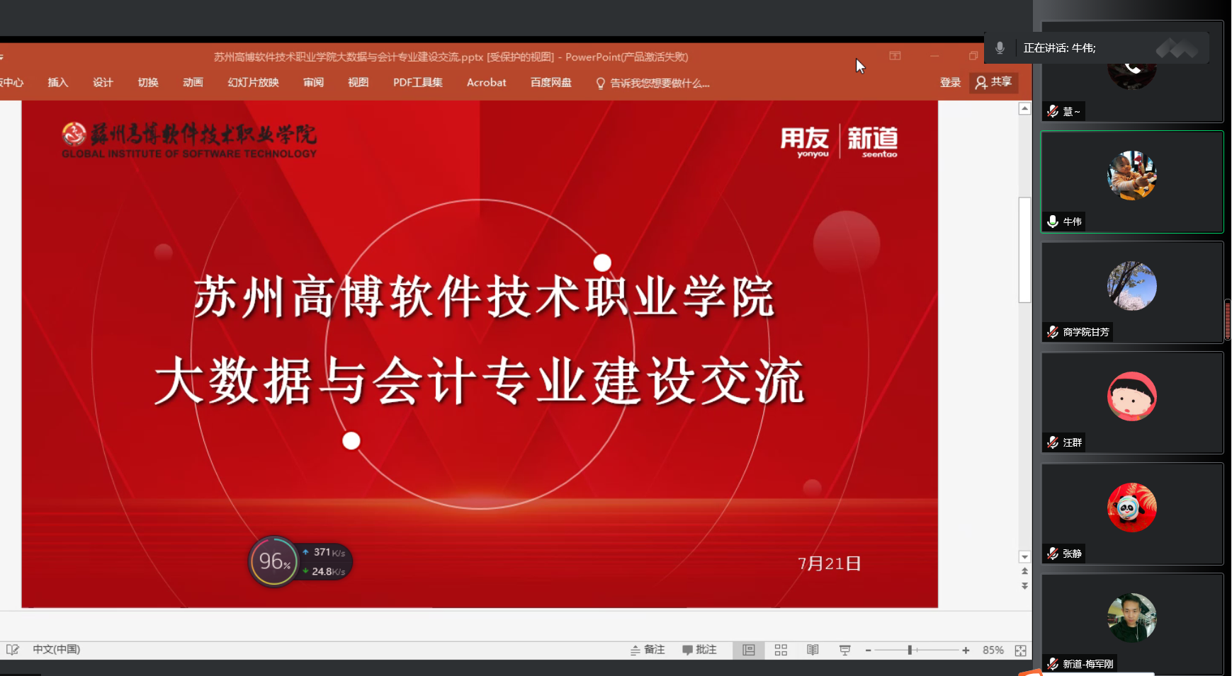 7月21日下午2点,国际商学院大数据与会计专业诚邀苏州新道科技股份有限公司高级教育顾问梅军刚老师、新道科技股份有限公司江苏省区的教育服务经理汪群老师及国际商学院相关领导召开了一次别开生面的线上专业建设研讨会。