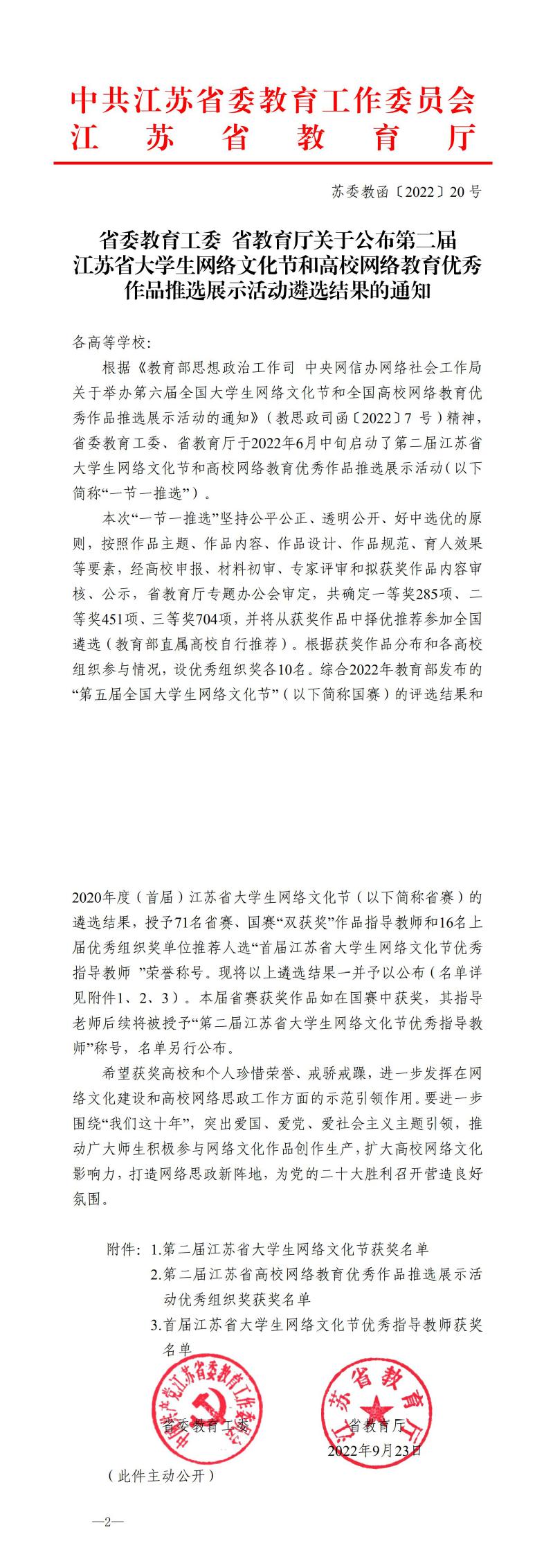 近日,第二届江苏省大学生网络文化节活动获奖名单揭晓。经过高校申报、材料初审、专家评审、拟获奖作品内容审核等,省委教育工委、省教育厅对第二届江苏省大学生网络文化节优秀作品进行展示活动,我校在微电影、动漫、摄影等三项作品征集活动中均有所斩获,共计6件作品获奖,其中一等奖2项,二等奖1项,三等奖3项。
