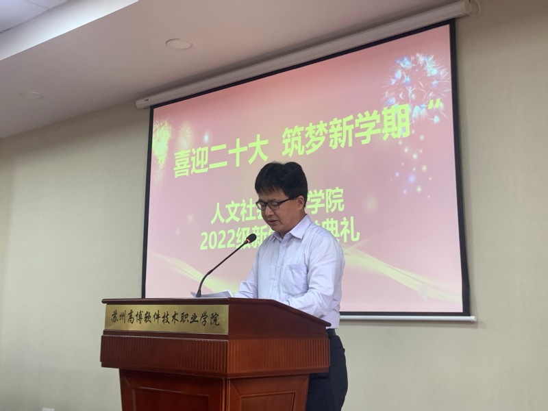黄兴院长首先致辞,代表全院师生向新加入人文学院大家庭的2022级全体新生表示热烈欢迎。黄兴简要介绍了人文学院专业设置及教育教学情况,表示近年来学院在认真抓好课堂教学的同时,积极拓展产教融合、校企合作渠道,深入实施课证融通,主动与国内国外高校对接,为学生开辟专接本、专升本升学通道,努力为学生搭建成长成才平台。黄兴就如何尽快适应大学生活、如何让大学生活过得更有意义更加精彩向新生们提出了三点希望。一是希望新生们学会学习。要增强学习主动性,主动制定学习计划,主动摸索学习方法,主动检验学习效果。要在认真学好专业知识、掌握专业技能的基础上,扩大阅读面,拓宽知识面。二是希望新生学会独立。努力培养独立生活、独立思考、独立判断、独立担当等能力。三是希望新生学会合作。希望新生们走出小自我,融入大集体,保持宽容的心态和合作的精神,在与人交往和合作中收获快乐、收获友谊、收获成长。