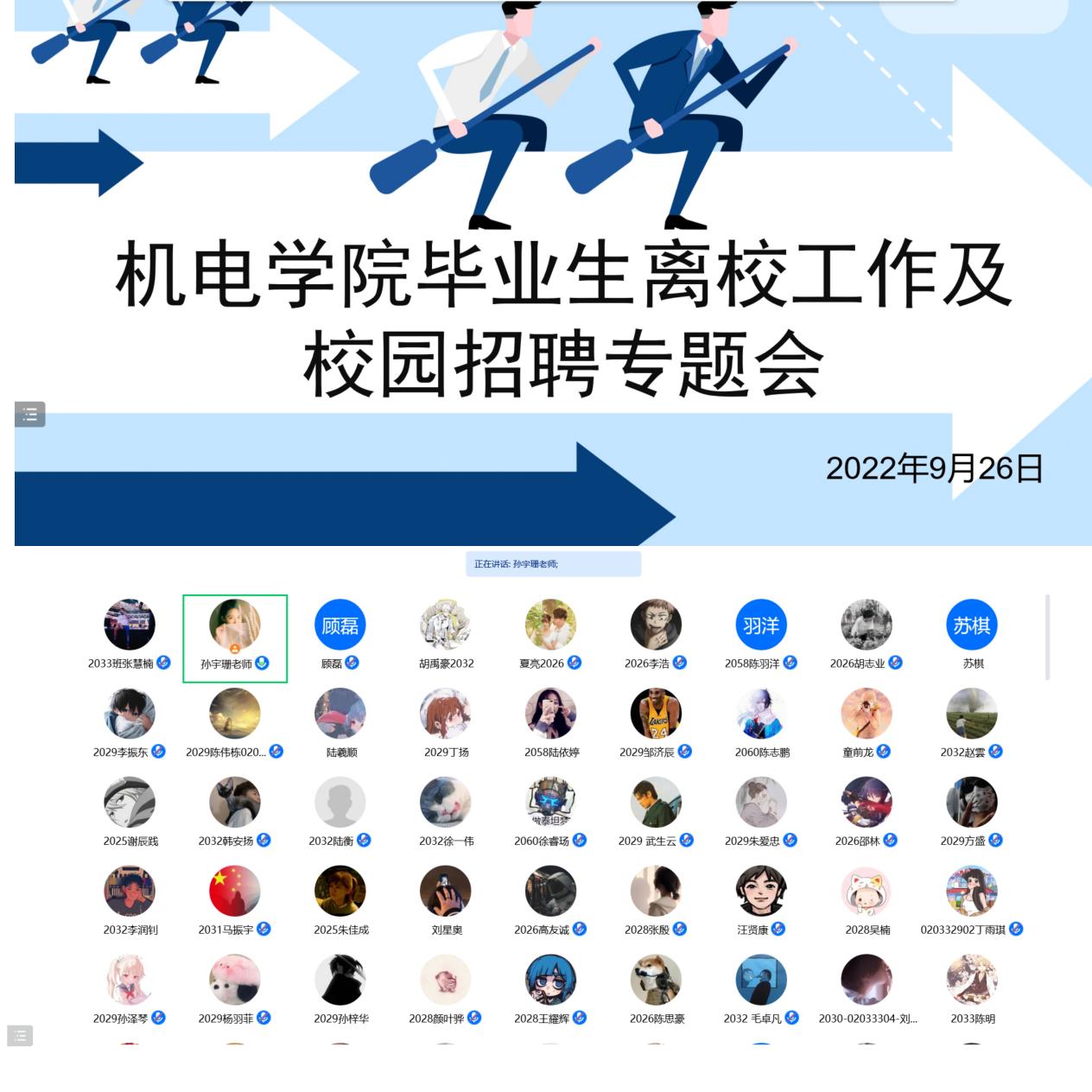 为加强毕业生的日常管理工作,进一步做好2020级学生离校实习期间的安全工作,引导毕业生安全有序离校。9月26日19:30,机电工程学院通过“腾讯会议”线上直播的形式召开“机电学院毕业生离校工作及校园招聘专题会”,所有毕业生参加会议。