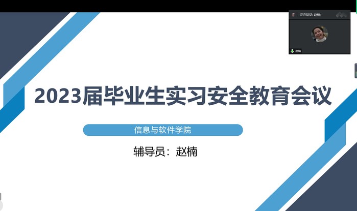 为落实好2023届毕业生实习工作,高质高效开展毕业生实习各项工作以及动员毕业生能更加积极地完成好实习任务,信息与软件学院于10月10日在腾讯会议上召开了岗位实习安全教育主题会议,2020级即将实习的全体学生参加,辅导员赵楠老师主持会议。