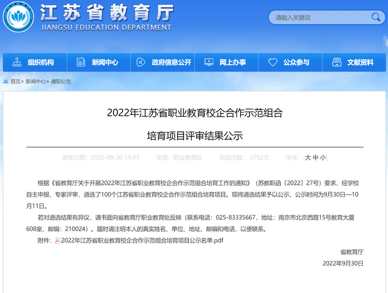 近日,江苏省教育厅公布2022年江苏省职业教育校企合作示范组合培育项目评审结果。经学校自主申报、专家评审,我校申报的“高博-亨通”软件技术企业学院入选江苏省职业教育校企合作示范组合培育项目。
