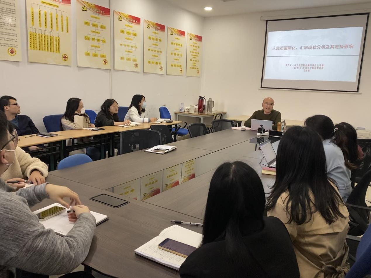 10月11日下午,国际商学院邀请了苏州大学商学院金融学博士生导师、我校特聘教授乔桂明为全体教职工做了精彩的学术报告。本次报告由国际商学院王则斌教授主持,国际商学院全体教职工参加了此次报告。