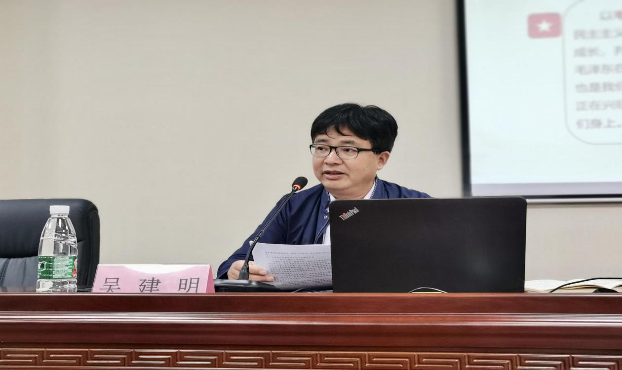 10月14日下午,人文社会科学学院在行政楼215会议室举办2022级新生第一堂党课,校长助理、学院直属党支部书记吴建明为新生作了题为“高校学生与中国共产党”的专题报告。院学工办主任赵雪飞、辅导员吴敬德以及2022级全体新生参加了党课。