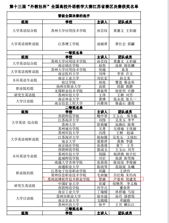 由江苏省高等教育学会指导、江苏省高等学校外国语教学研究会和上海外语教育出版社主办、苏州科技大学承办的第十三届“外教社杯”全国高校外语教学大赛江苏省赛区决赛日前在苏州落下帷幕。经过初赛、复赛、决赛等环节,由我校人文社会科学学院外语系管漪、卢春林、倪建美等三位教师组成的教学团队在本届比赛中勇创佳绩,获得职业院校组二等奖。