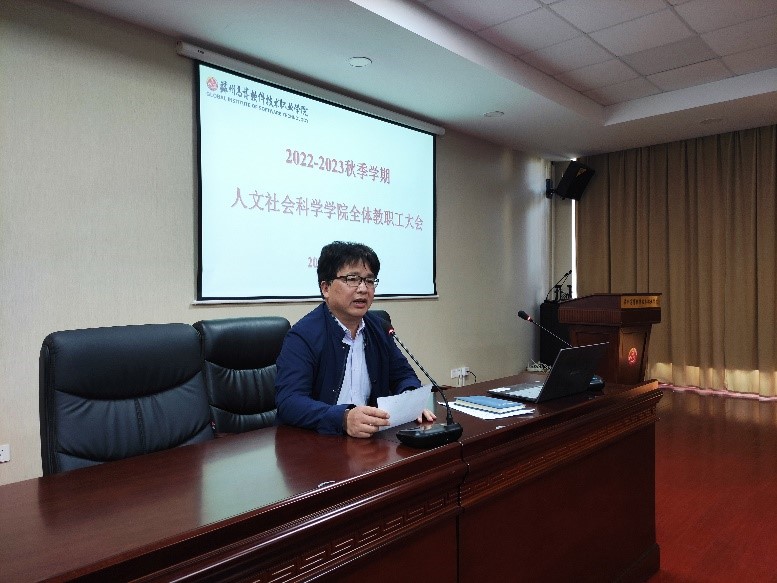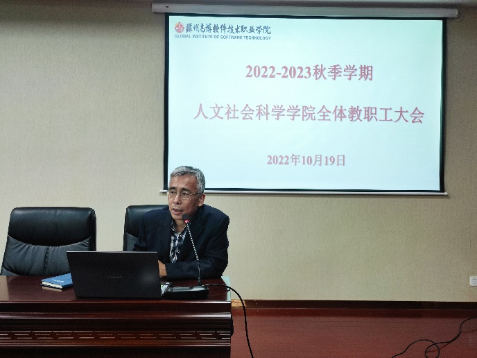 10月19日下午,人文社会科学学院在行政楼215会议室召开2022-2023年秋季学期教职工大会,院党政领导班子成员及全体教职工出席会议。会议由校长助理兼学院院长黄兴主持。